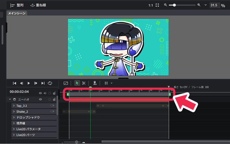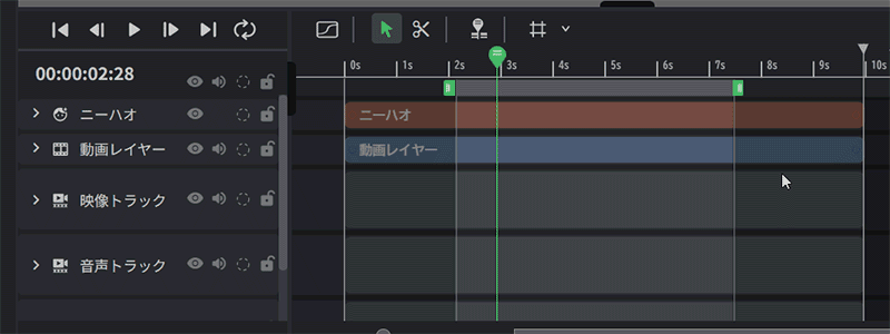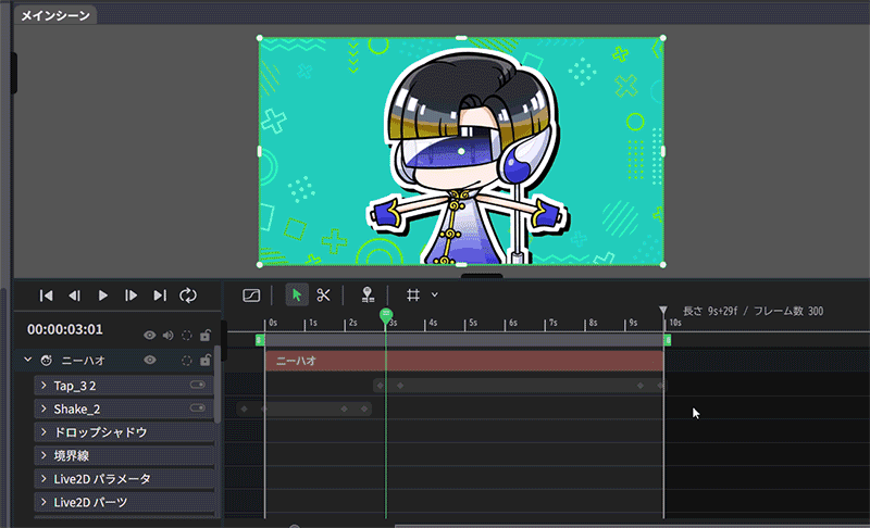 タイムライン上の動画や音声、Live2Dモデルといった素材を任意の長さに分割したり、必要な部分だけ切り出し不要な部分を削除するなど細かな編集ができます。