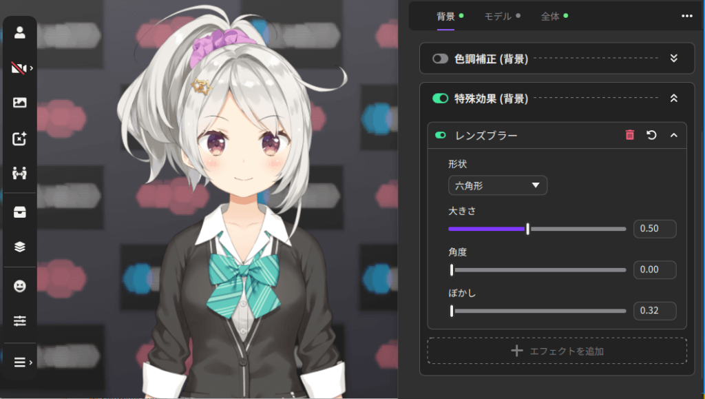It is possible to apply effects to the background, the model, and the whole image respectively.