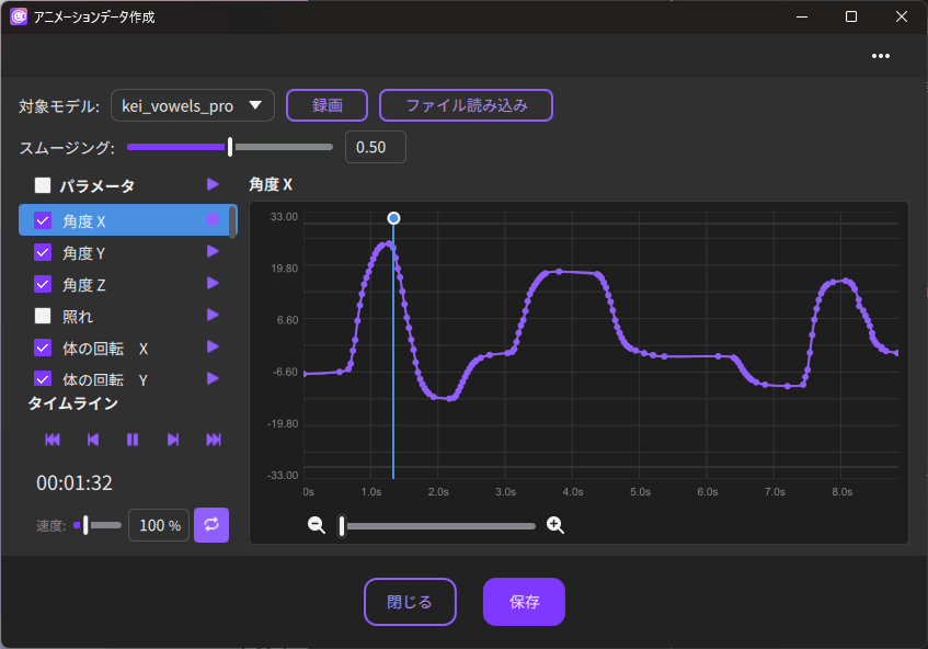 | Save Button | You can save recorded animation as motion3.json. Only checked parameters will be exported, and the destination folder will open when saving is complete. |