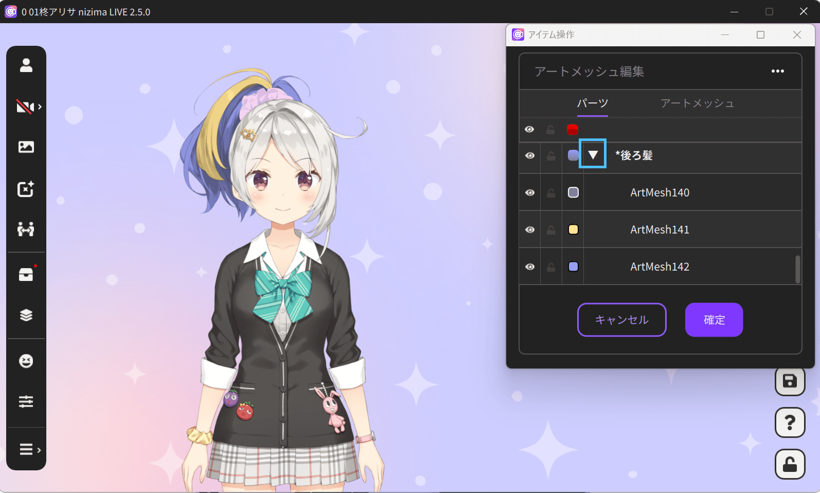 If you want to change part colors in more detail, click the triangle icon next to the part. The art meshes within the part folder will be displayed, allowing you to change colors individually.