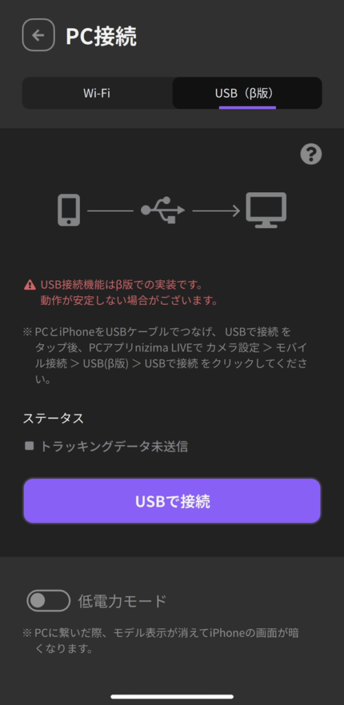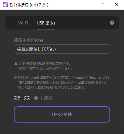 - 4. Tap “PC Connection” > the “USB (beta version)” tab > “Connect via USB.” The [Status] changes to [Sending tracking data].