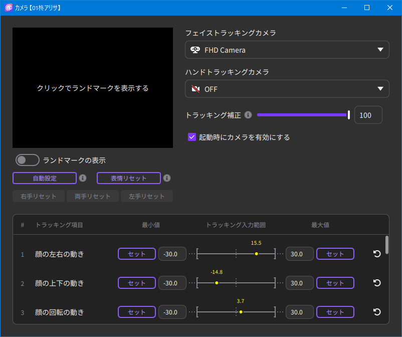 ウェブカメラで読み取った実写映像をもとに、トラッキングのランドマークを表示、ウェブカメラ、ハンドトラッキングカメラの切り替えや表情、手のリセット等の詳細設定を表示します。