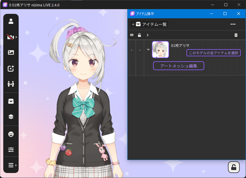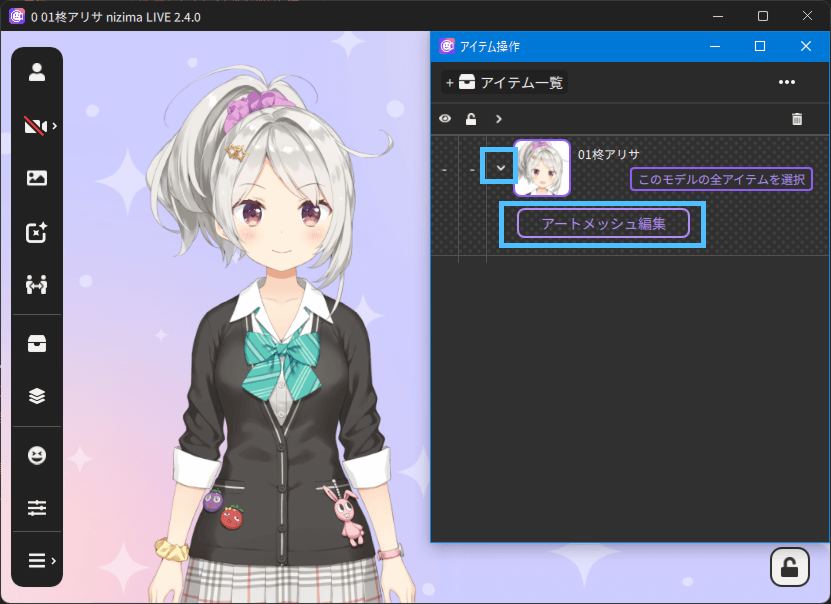 アイテム一覧のモデルアイコンの左にあるvアイコンをクリックすると表示されるアートメッシュ編集ボタンを選択します。