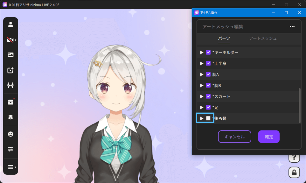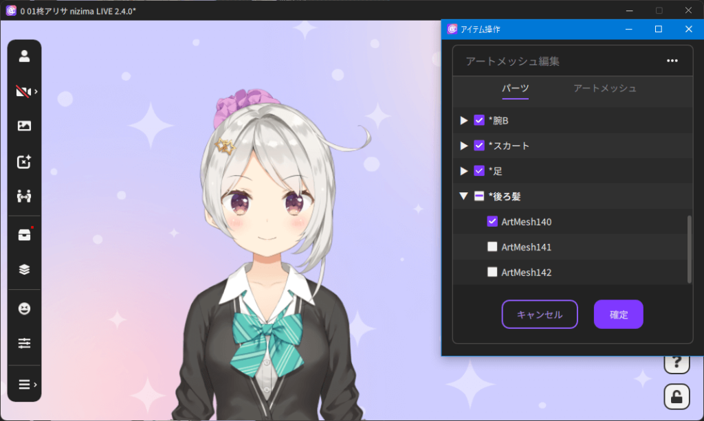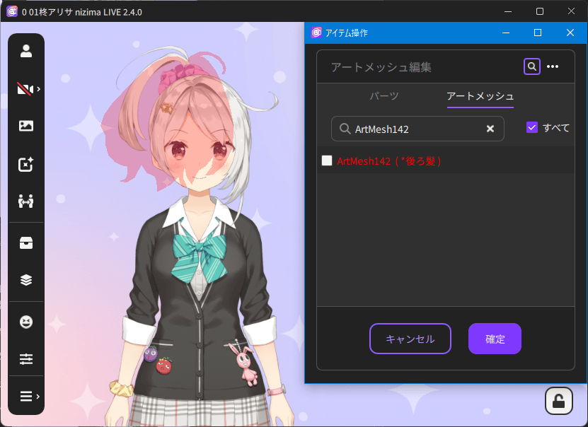 選択中のアートメッシュが表示されるのでチェックボタンを外すと、アートメッシュが非表示になります。