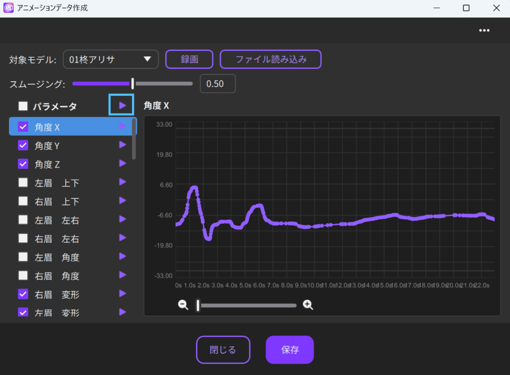 5.パラメータ横の再生ボタンを押すと、アニメーションが再生されます。