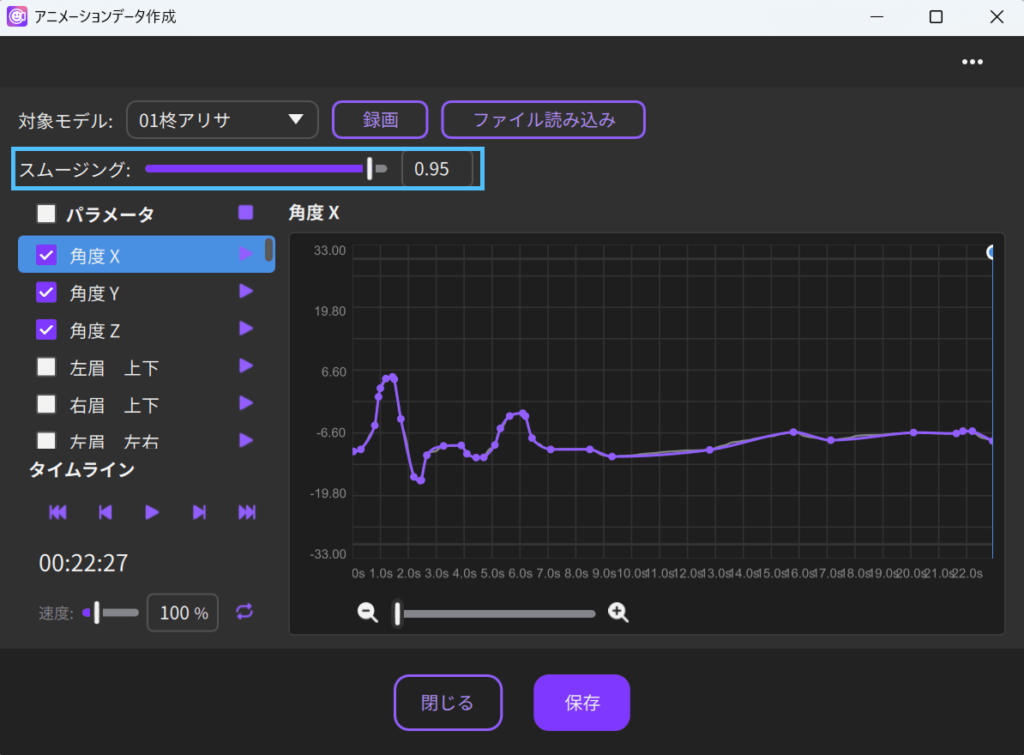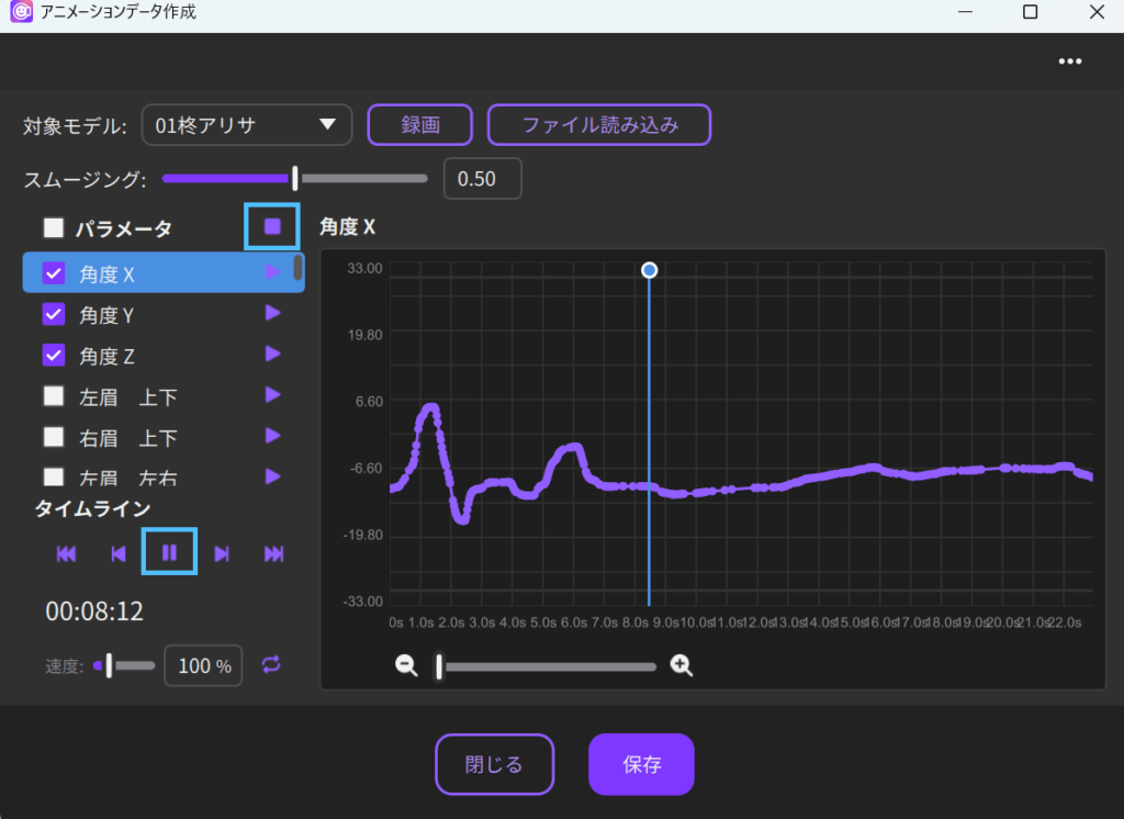 この時、動画に音声データがある場合、リップシンクが自動的に反映されます。スピーカーボタンで音声の再生/停止を切り替えできますが、音声をオフにしてもリップシンクは継続して反映されます。