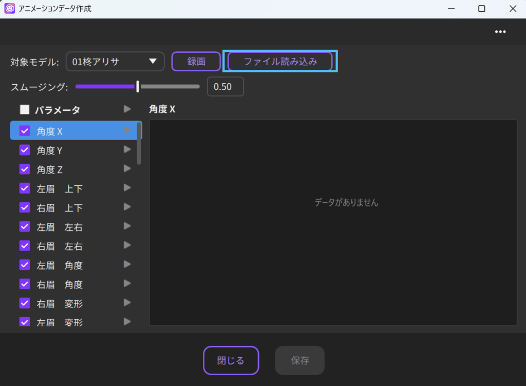 1.アニメーションデータ作成ウィンドウでファイル読み込みからmp4、movなどを選択します。