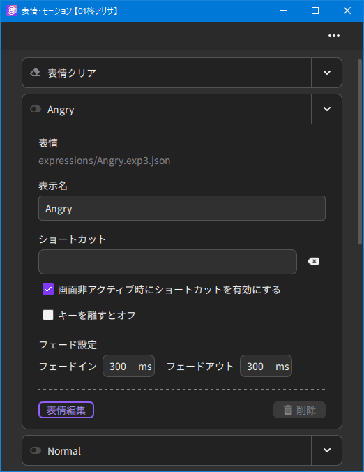 - 5. 「ショートカット」に、開いた表情・モーションに割り当てたいショートカットキーを入力します。