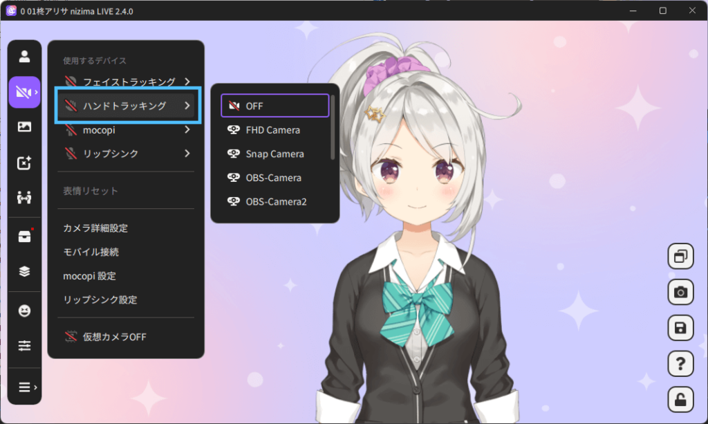 メインウィンドウの左のメニューからハンドトラッキングをクリック、ハンドトラッキングに使用するカメラを選択します。