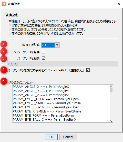 打开Cubism 2.1创建的模型数据,点击[建模]菜单 → [转变模型ID],显示[转变设置对话框]。
