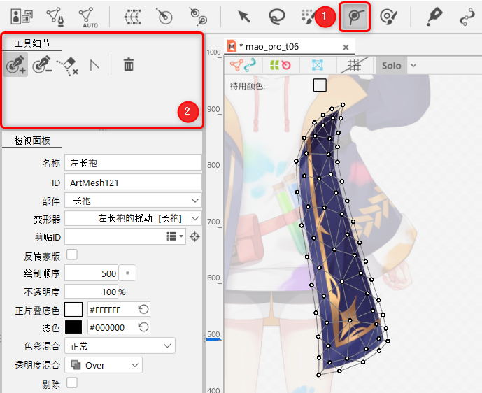 确认选择了②中[工具细节]面板上的[追加控制点]按钮。