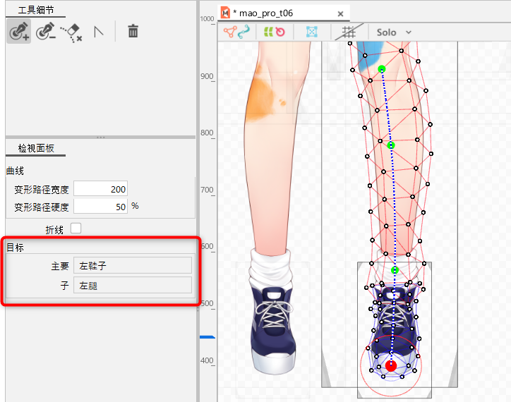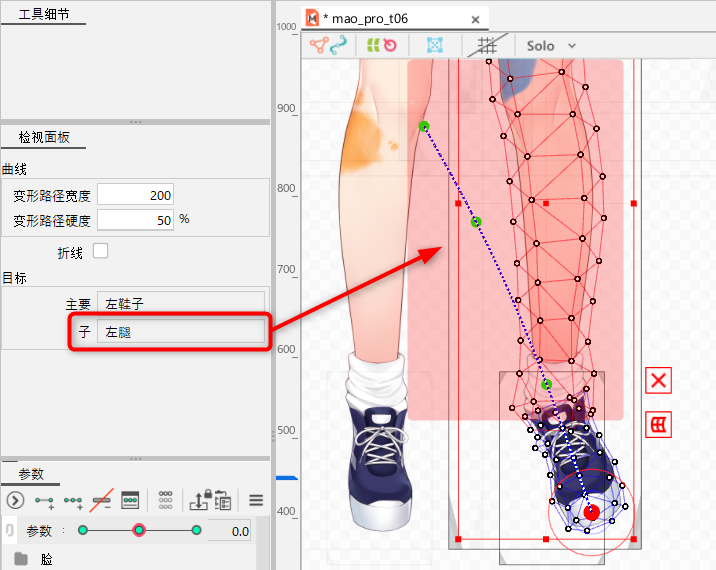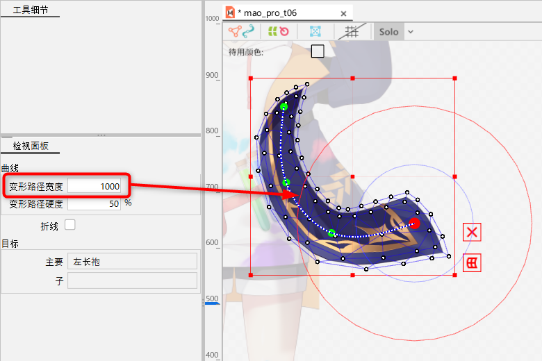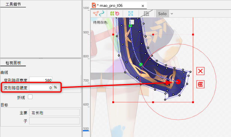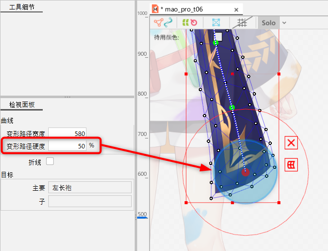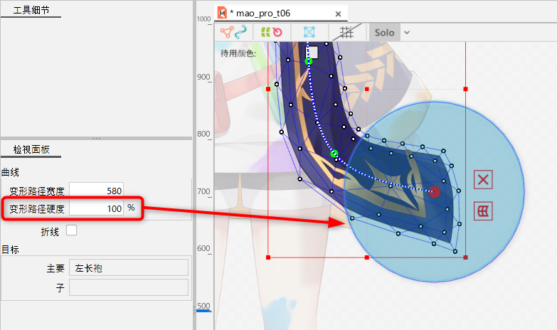 当变形路径硬度值设置为100%时,蓝色圆圈与变形路径宽设置的红色圆圈重叠。