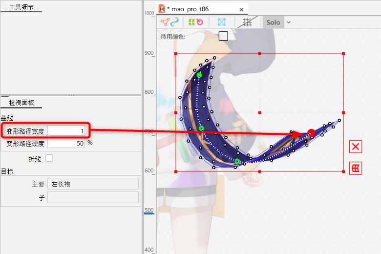 减小变形路径宽会缩小控制点周围的红色圆圈。