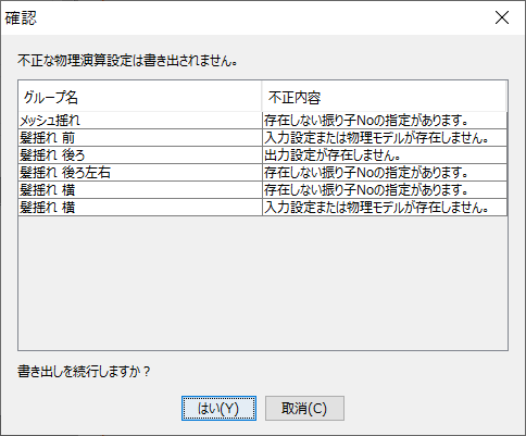 如果物理模拟设置处于无效状态,将显示确认对话框,并且不会输出无效的物理模拟设置。* 输出物理模拟设置时也会显示同样的对话框。