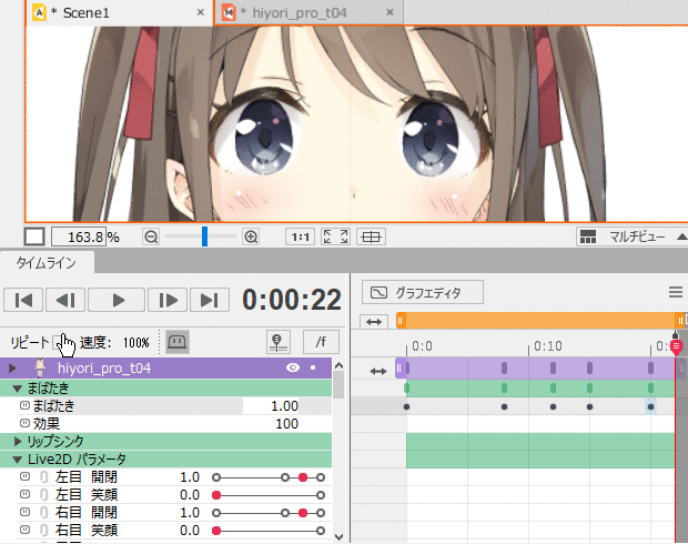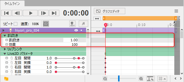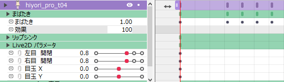 “左眼 开合”和“右眼 开合”的参数只有第一帧的关键0.8(眼睛未完全睁开的状态),但眨眼设置值将乘以参数关键帧,因此为眨眼动作。