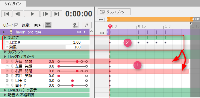 进行眨眼设置时,眨眼设置的内容(②)与附在“眼睛开合”中的眼睛表现(①)通过正片叠底进行混合。