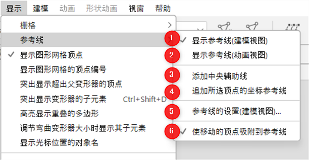 | 2 | 显示辅助线(动画视图) | 可以在动画视图中将显示辅助线。 *(这些是特定辅助线,而不是在建模视图中设置的辅助线。) |