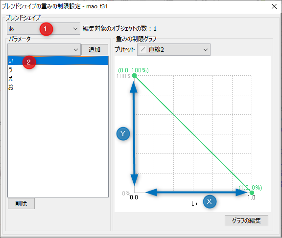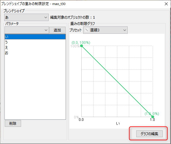 对于融合变形“A”,我们追加了要限制的参数“I”、“U”、“E”和“O”。[预置]被指定为“直线3”。