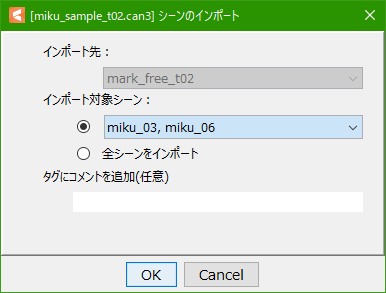 打开场景载入设置对话框,在[导入的目的场景]中指定导入的目的场景的动画文件(当前在Editor上打开的动画文件),在[导入的对象场景]中指定希望载入的场景(可多选)。