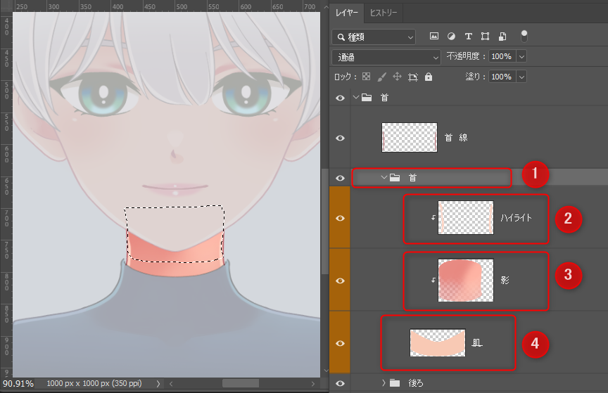 图层结构是从④“皮肤”图层对②“高光”和③“阴影”图层应用剪贴蒙版。