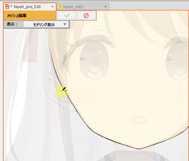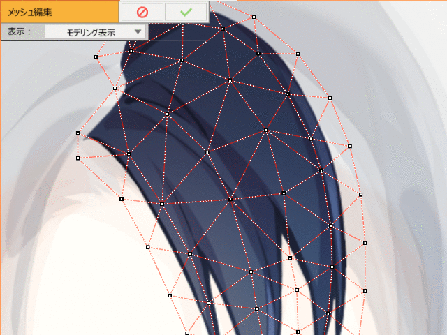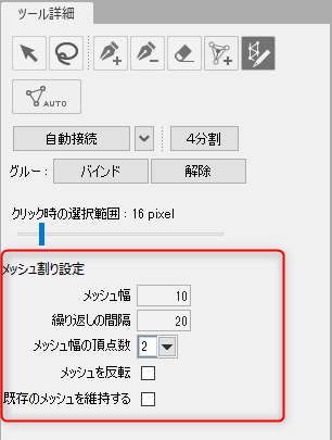 | 自动连接 | 生成多边形,这是构成网格的最小元素。可以从右侧的按钮中选择以下选项。 网格重建: 启用后,仅考虑顶点重绘网格线。如果您想保留自己连接的线,请禁用该功能。 保持边轮廓: 启用后,会在保持轮廓的同时自动生成。使用扭曲的纹理(睫毛、头发等)是有效的,因为它不会连接额外的线条。 为了在启用“保持轮廓”的状态下执行自动生成,需要预先连接所有顶点的轮廓。 |