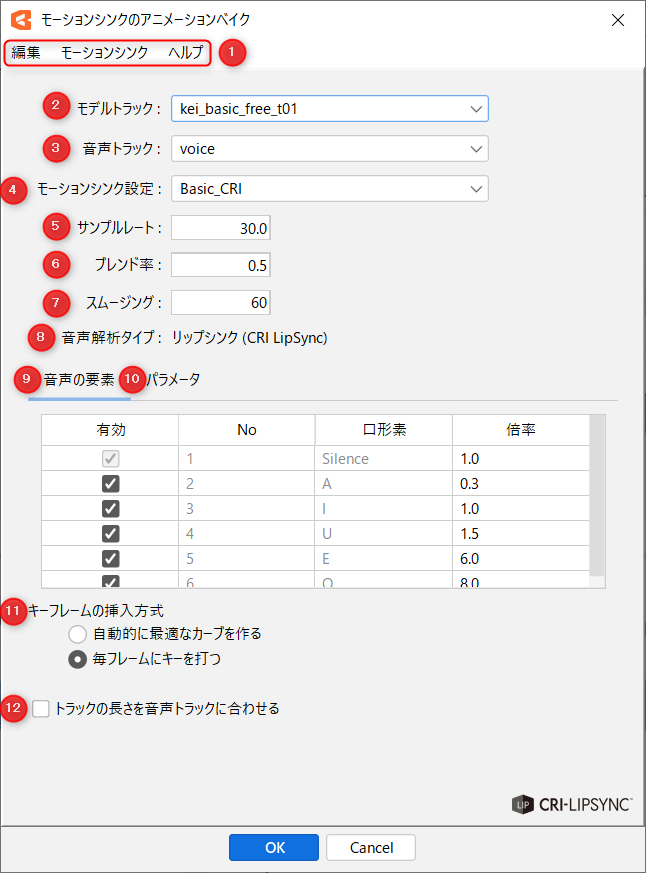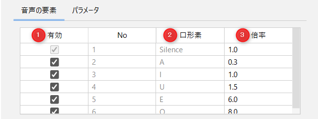 | ② | 视音素 | 进行映射的声音元素的类型。 Silence:没有声音 A、I、U、E、O:元音 |