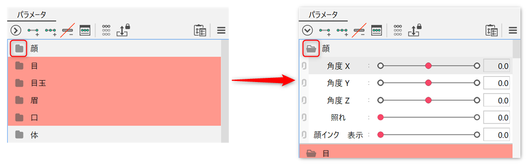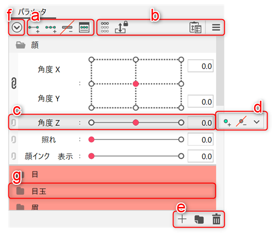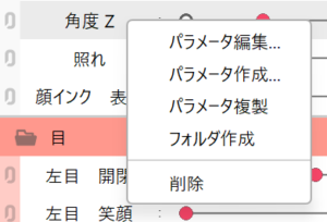 | ② | 参数名称 | 显示参数名称。 右键单击名称以显示以下菜单。 ![]() 参数编辑: 打开[编辑参数]对话框。 ![]() 名称: 参数的名称。它可以进行任意设置。 ID: 参数的ID。 您可以进行任意设置,但如果规范中没有规则,建议使用“标准参数列表”中的ID创建。 最小值、默认值、最大值: 您可以设置参数的最小值、默认值和最大值。 参数值范围可以任意设置,但除非规范中有规定,否则建议使用“标准参数列表”中的值创建。 循环: 选中此项以设置参数的循环(循环设置)。 有关详细信息,请参考“循环”。 融合变形: 如果它是融合变形的参数,则选中。 有关详细信息,请参考“融合变形”。 ID规则显示: 打开[关于ID]对话框。 创建参数: 打开[创建新参数]对话框。 复制参数: 仅复制参数设置。 物体和关键点不会被复制。 创建文件夹: 创建一个新参数组。 组名称是自动创建的,但您可以通过双击名称部分来变更它。 删除: 在选择参数或参数组的状态下单击,则可以进行删除。 如果删除里面有参数的组,则里面的所有参数都会被删除。 |