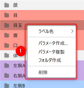 | ① | 组名 | 显示组名称。 通过在组上按右键,将在弹框中显示以下功能。 标签颜色: 参数组可以设定颜色。 有关详细信息,请参考本页“参数组的颜色区分”。 创建参数: 打开[创建新参数]对话框。 复制参数: 仅复制参数设置。 物体和关键点不会被复制。 创建文件夹: 创建一个新参数组。 删除: 您可以删除组。 如果删除里面有参数的组,则里面的所有参数都会被删除。 |