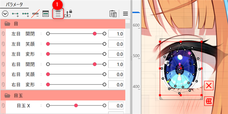 | ① | 结合下面的参数 | 单击后立即结合并显示下方参数。 由于滑块上的当前值可以上下左右移动,当用于在X和Y方向上移动的参数时,可以进行直观的操作。 |