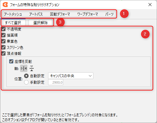 | 3 | 位置 | 可以通过[自动设置]或[手动设置]设置反转中心位置。 自动设置: 可以选择“画布中心”、“选定的物体中心”或“父变形器中心”。 手动设置: 在画布上设置任意座标。 |
