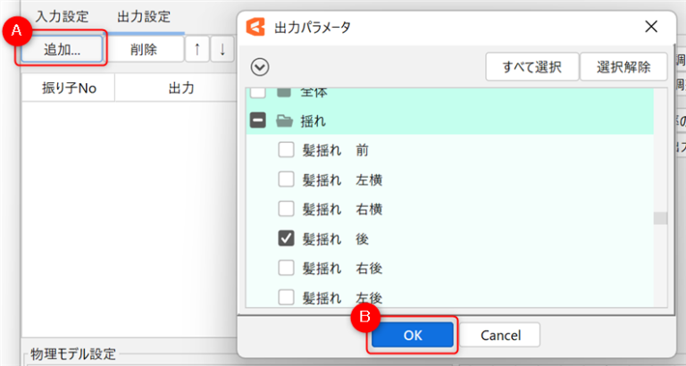 | ② | ![]() | 单击[追加] (A),打开[输出参数]对话框。 从[输出参数]对话框中,选择要移动的参数,然后单击[OK] (B)。 |