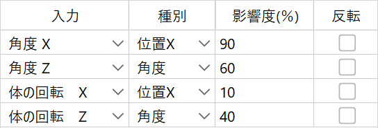 在预置中,设置了“角度X”、“角度Z”、“身体旋转X”和“身体旋转Z”,也可以将输入参数设置为另一个参数。