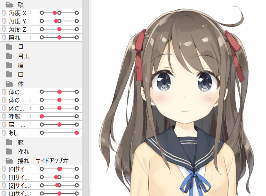 | 是弱化“角度X”的影响、强化“身体旋转X”的影响的设置。 由于动态过程中“身体旋转X”的动作较弱,因此头发和丝带几乎不会摇动。 |