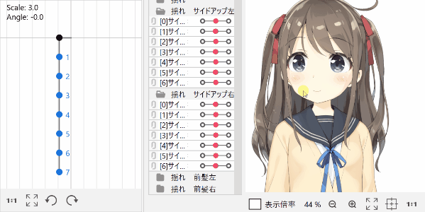是强化“角度X”的影响、若化“身体旋转X”的影响的设置。 由于动态过程中“角度X”的动作较强,因此头发和丝带会用力摇动。 |