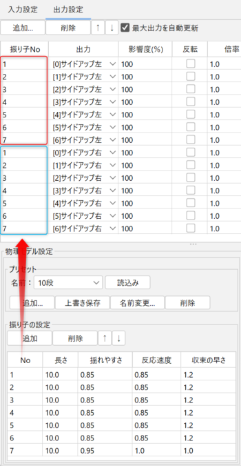 | ③ | ![]() | 在[物理模拟模型设置]中,检查用于输出的参数数量是否与[摆锤设置]中的[No.]匹配。 例如用于输出的参数数量为5,预置为“10段”,则请[删除][No.]“6”后的摆锤。 反之,如果用于输出的参数摆锤不够,请点击[追加]。 即使在[物理模拟模型设置]中将摆锤设置为多段,如果[输出设置]中的所有[摆锤No.]都设置为“1”或编号不正确,它也不会干净摇动,敬请注意。 |