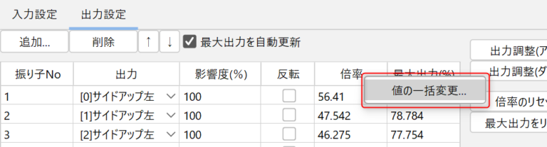 要批量变更多个输出参数的倍率时,请右键单击[倍率] → [批量变更值]。
