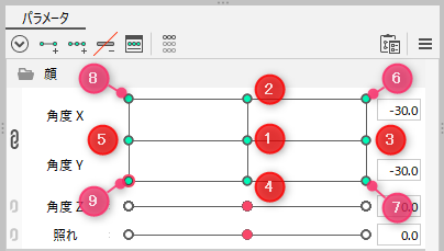 当[基准的参数值]为[参数中心]时,由参数1[角度X]和参数2[角度Y]的最小值和最大值的中位数生成四个角,形状为②③④⑤。