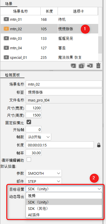 如需变更,请选择目标场景(①),并从检查器的[目标设置](②)中进行变更。