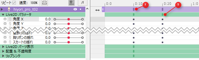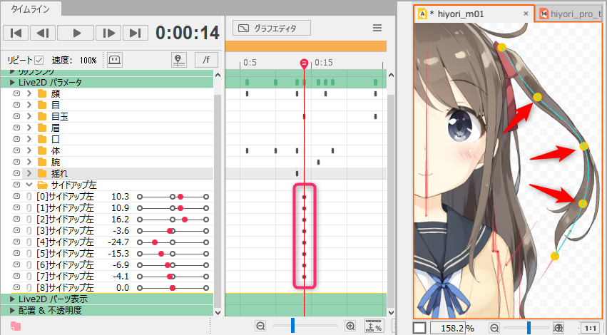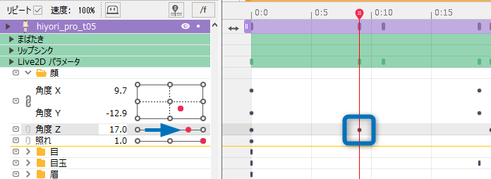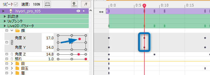 选择要插入位置的帧,通过移动“Live2D参数”的滑块、或输入数值,可以为该参数值插入一个键。