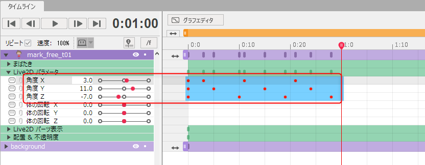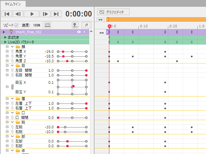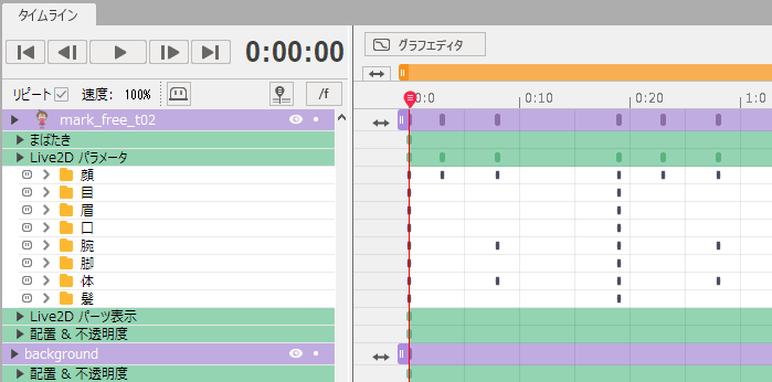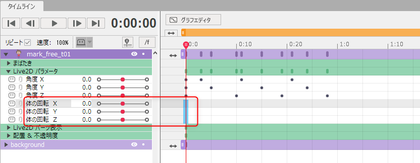 在[Live2D参数]的[属性]组上按右键 → 通过[插入关键帧]在组内的所有属性中插入键。